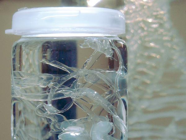Like mortal remains of the last witnesses from worlds beyond our imagination, these transparent beings are on display in preparation glasses – hardly distinguishable from the fluid they are hovering in. Their structures only hint on former beauty and unobtainable habitats. Perpetually exposed to our looks they just might finally fade away. What did you think we could grasp?